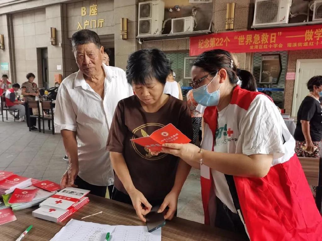温州市龙湾区红十字会联合瑶溪街道红十字会在瑶溪街道南洋社区红十字博爱家园开展“世界主题日”急救活动,手把手为群众传授心肺复苏、AED操作、创伤包扎等急救知识和技能。