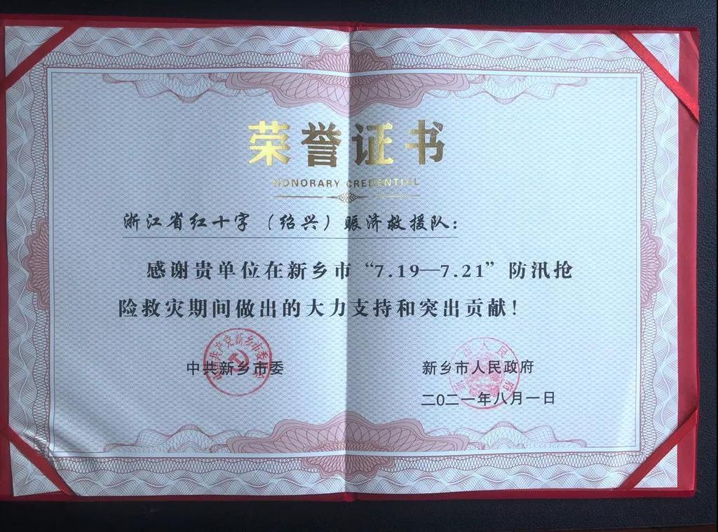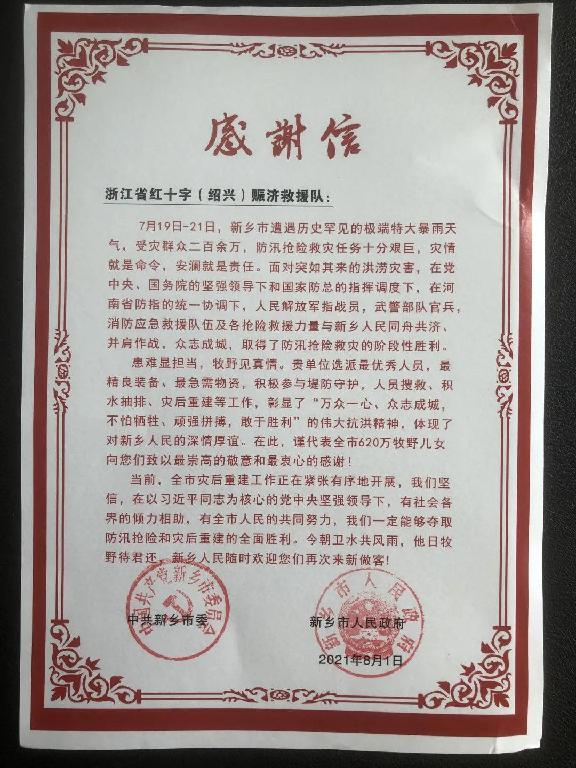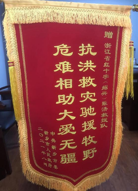 近日,绍兴市红十字会收到了河南省新乡市人民政府寄来的感谢信、荣誉证书和锦旗,感谢我市红十字应急救援队在新乡市防汛抢险救灾期间做出的支持和贡献。