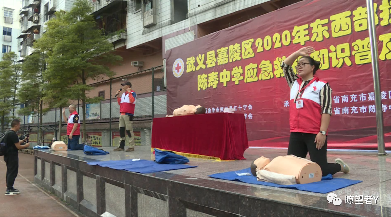 在南充嘉陵的陈寿中学,还开展了“陈寿中学应急救护知识普及培训”,来自武义县红十字会的二位救护培训讲师与南充嘉陵红十字会“手挽手”,采取“救护理论+实践操作+现场测试”相互结合的方式向1000多位学生开展应急救护知识和技能普及培训,用通俗易懂的语言和生动的演示给学生们讲解和现场示范了救护概念、心肺复苏、气管异物梗阻等应急救护知识和操作步骤,学生们争相上台,在培训师的指导下分批在人体模型上动手练习心肺复苏术。