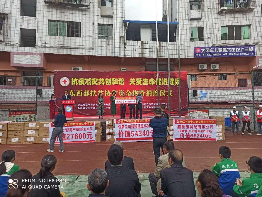 武义县红十字会党组书记、常务副会长郑淑央代表捐赠方把总价值644899元的捐赠款物转交给嘉陵区政府、嘉陵区红十字会。价值54340元的988只保温杯和价值27600元1000只的保温杯转赠发放给陈寿中学,价值66240元的180听“佳贝艾特”奶粉,分别转赠到大通幼儿园、安平幼儿园、李渡幼儿园和金凤小学、新桥小学,帮助这几个学校的贫困幼儿增强体质。作为捐赠方的浙江省武义县人民政府和武义县红十字会,现场还向10位困难家庭代表发放了1000元的捐赠资金。