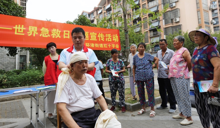 9月10日,月河街道红十字会联合社区卫生服务中心在东湖家园红十字文化公园开展广场宣传活动,通过发放宣传折页、急救包,演示急救技能等多种形式,为居民普及急救知识。当天,环渚街道红十字会联合环渚卫生院,在北白鱼潭社区开展宣传活动,指导居民学习心肺复苏、止血包扎等急救技能,提高广大居民自救互救能力。