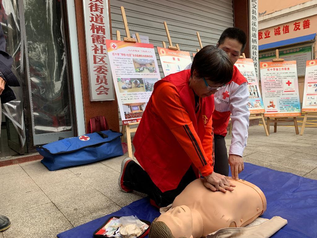 在栖霞社区,红十字会工作人员在社区室外为社区居民介绍了突发心搏骤停情况的应急救护处置办法,为大家讲解心肺复苏的具体操作步骤和要点,并利用模拟人演示操作步骤。居民们看过后表示:“学会这个急救的办法,关键时刻能救命呐!”