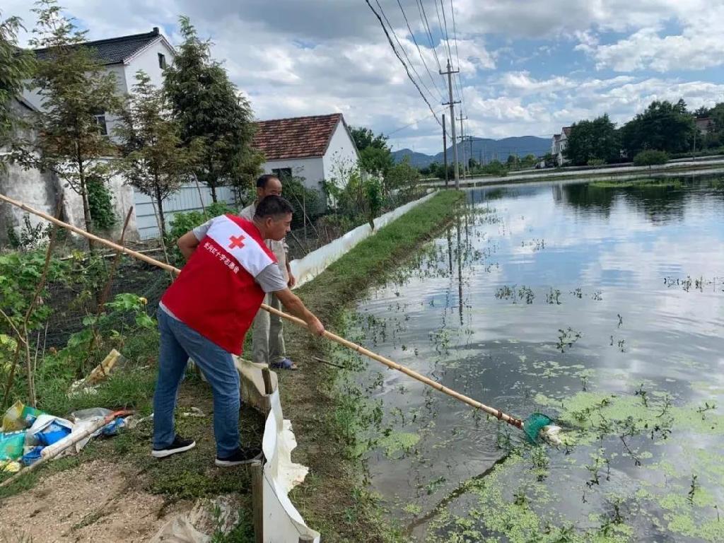 长兴县洪桥镇太湖村红十字会组织红十字会员和志愿者,帮助该村扶贫对象清理蟹塘,助农增产增收。
