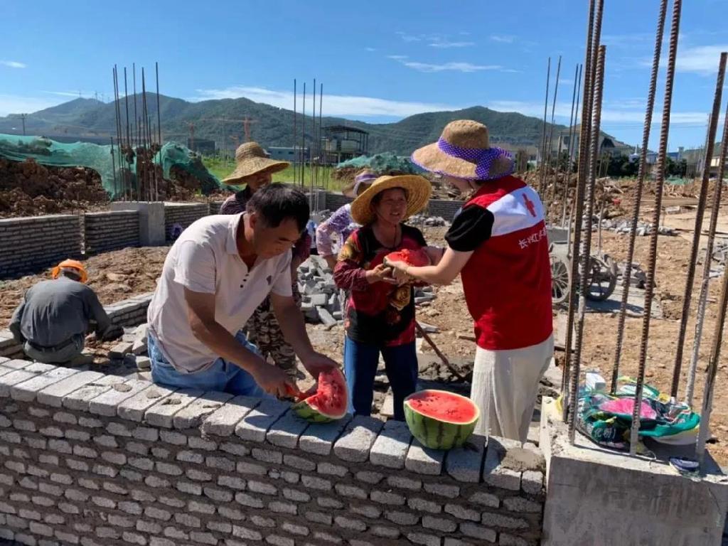 近日,长兴县洪桥镇亭子桥村红十字服务站组织红十字会员和志愿者,到村文化礼堂和综合办公楼的工地上,为工人们送上藿香正气水、西瓜等消暑物品。