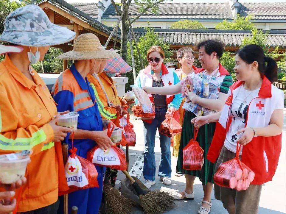 8月17日,德清县和新市镇红十字会组织红十字会员和志愿者,为新市古镇的环卫工人送上250份急救包和清凉汤。
