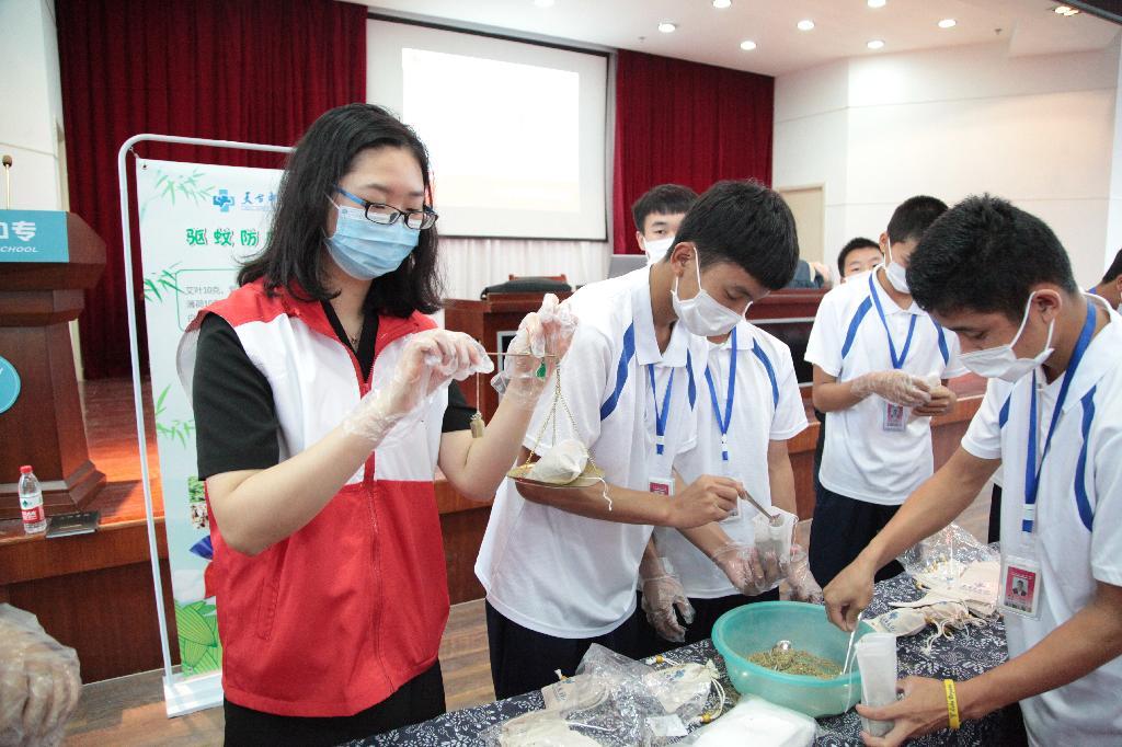 县中医院的医生们带来了制作端午香囊用的中药材,指导学生装填。随后,学生接受专业的应急救护技能培训。天台县应急救护培训“96345”党员志愿服务队队员用生动活泼的语言,现场示范教学,教学生掌握初步的应急救护技能。