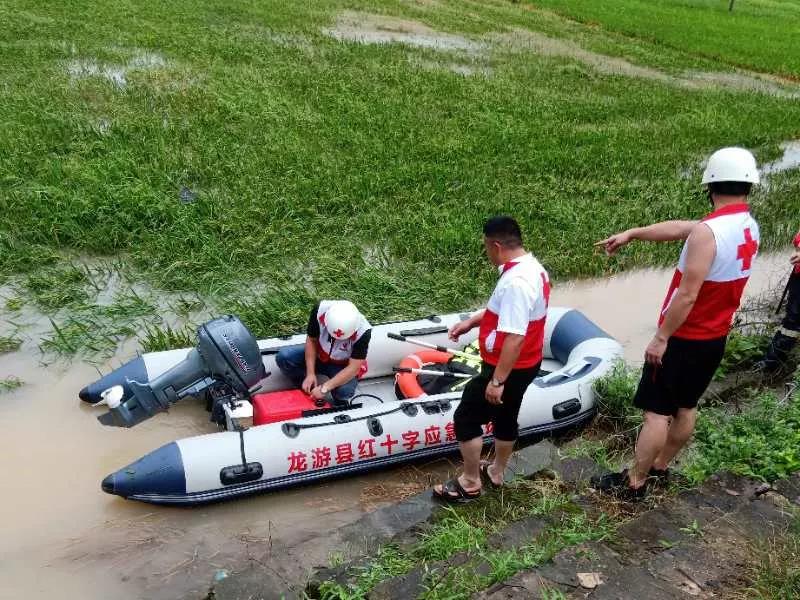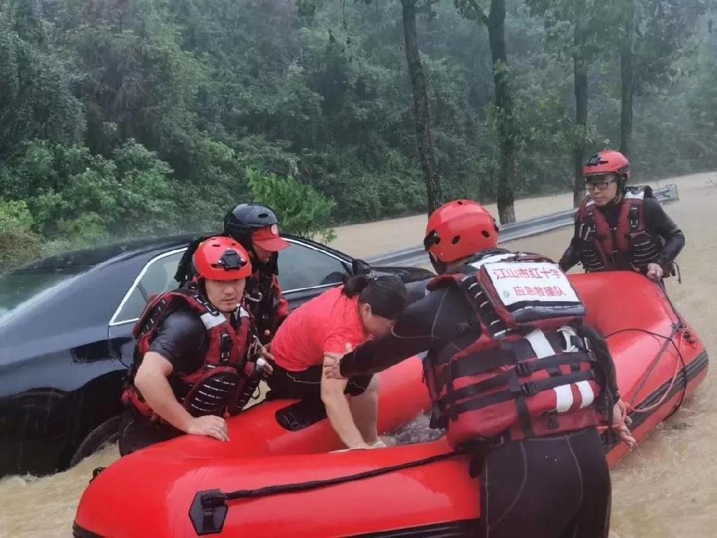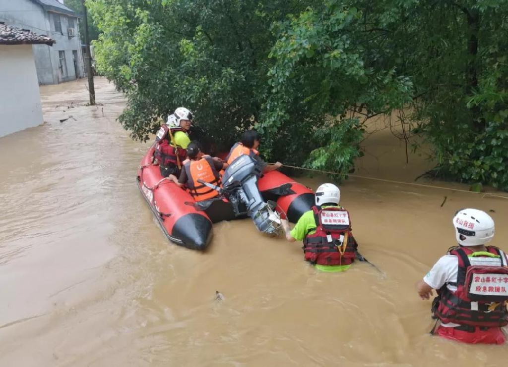 江山市红十字应急救援队接到110和市应急管理局下达的救援任务后,第一时间组织48名队员,出动2辆救援车、18辆私家车和4艘冲锋舟等,分别前往大桥镇、坛石镇横渡村、峡口镇东坑村和新南二街状元里路段展开救援行动,全面排查安全隐患,紧急转移20余名受灾群众。