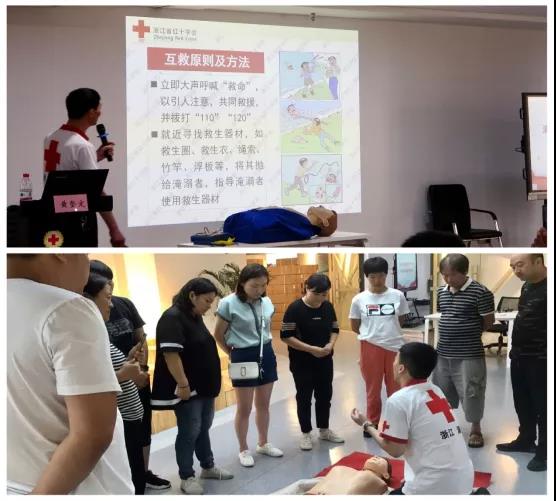 青田县红十字会为北山镇千峡湖度假村企业开展应急救护培训。培训采取线上理论学习和线下实践操作相结合的方式进行授课,红十字救护培训讲师针对景区实际需求,围绕心肺复苏、创伤救护、意外伤害处置和疫情防控等相关知识展开讲解,并手把手规范指导学员进行现场实践操作。