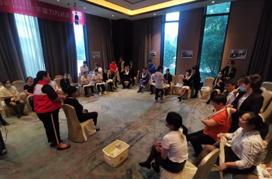 金东区红十字会为金华富力万达嘉华酒店的35名员工开展红十字救护员培训。红十字救护培训讲师围绕红十字运动基本知识、心肺复苏术、气道异物梗阻、创伤救护、意外伤害、突发事件处置和疫情防控等相关知识进行讲解,同时针对酒店行业特点,对地震、火灾等灾害的逃生避险和自救互救等知识进行重点讲解和现场示范演示。经过培训,所有学员全部通过考核,取得红十字救护员证。