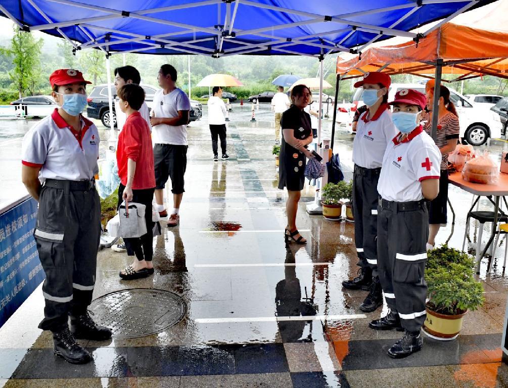 在连续的阴雨中,雨水和汗水浸透了志愿者的衣背,但他们依然热情高涨。他们用精湛的服务、良好的仪容、文明的举止,打造了嵊州红十字救援的金名片。