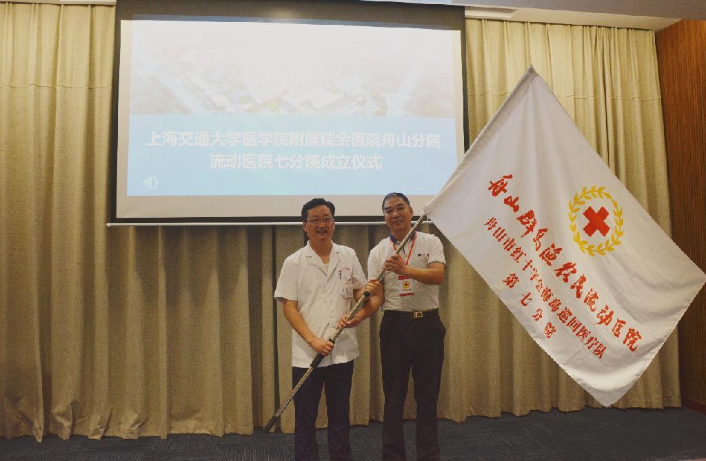 7月3日,舟山群岛渔农民流动医院再添新成员,上海交通大学医学院附属瑞金医院舟山分院成功举办第七分院成立仪式,正式成为舟山群岛渔农民流动医院的一员。市红十字会副会长叶跃胜、市组织部派驻上海瑞金医院舟山分院党建指导员岑慧丰书记、上海瑞金医院舟山分院副院长(流动医院第七分院院长)何静兵及30名医疗志愿者参加成立仪式。