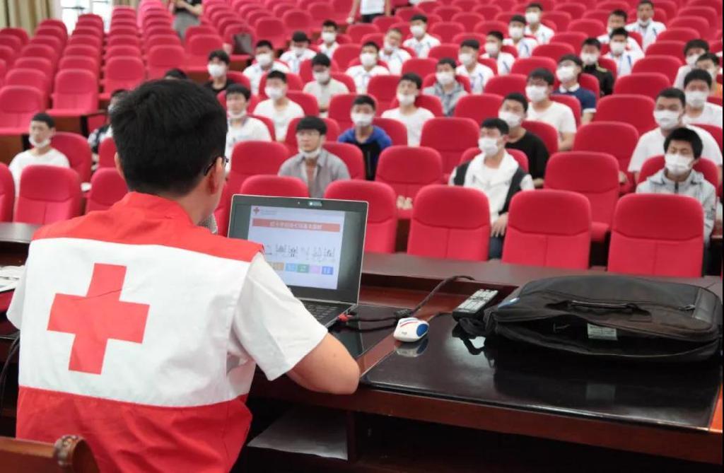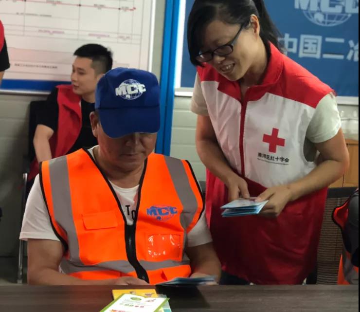 湖州市南浔区练市镇红十字会走进中国二冶练市镇市民中心建设工地,为工人普及应急救护知识,并送上日常生活用品。