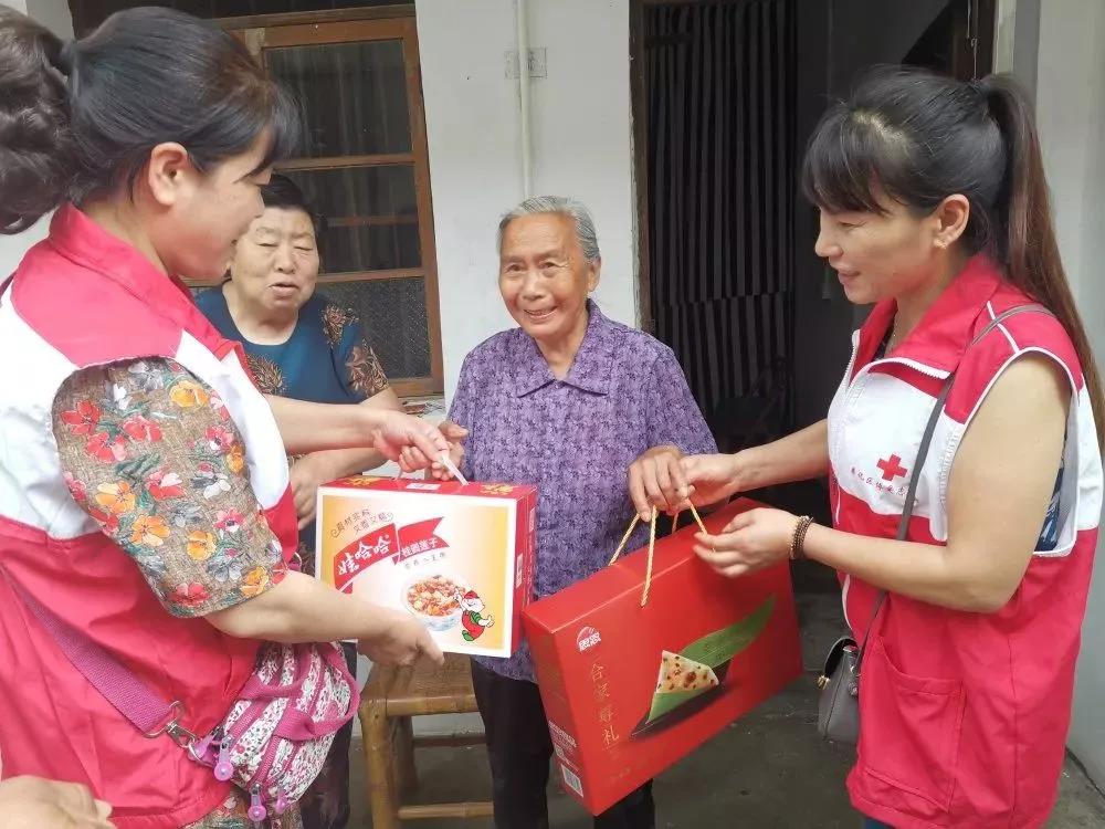 宁海县跃龙街道车河社区和花园社区红十字博爱家园,分别组织人员上门看望辖区高龄独居老人,并送上粽子、鸭蛋等慰问品。