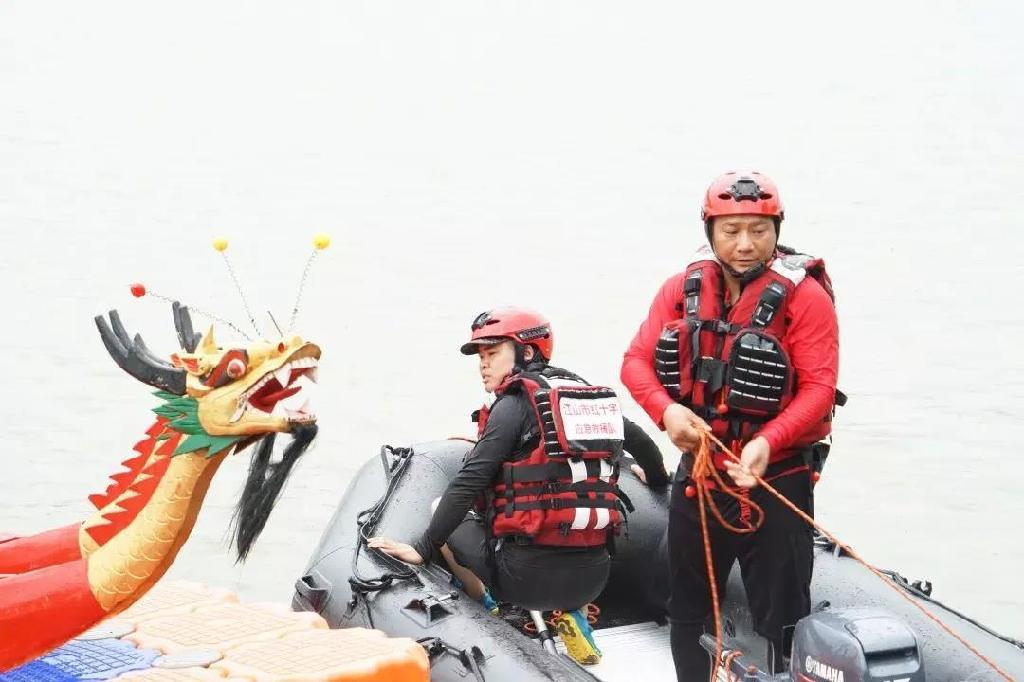 江山市红十字应急救援队为该市端午体育嘉年华活动(龙舟赛、游泳赛)提供安全保障。队员们全程参与赛事准备工作,并提前对赛道水域进行风险排查及清理。救援队的出色表现获得组委会和参赛人员的一致好评。