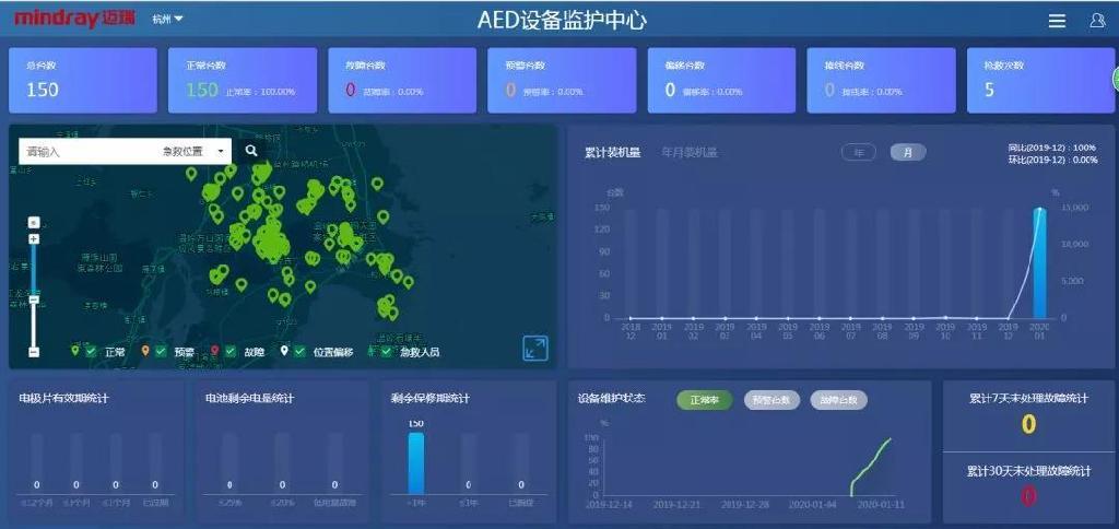 通过管理后台,还可以看到每一台AED的使用情况,如电池、电极片使用期限,是否有使用记录等都一目了然。每一台机器都有一名管理员负责日常监管,做到了线上线下24小时不间断监控,有效确保了AED的正常使用和管理。