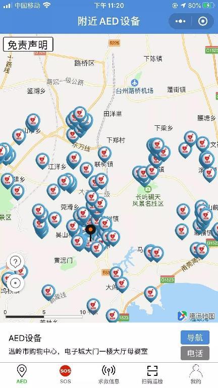 在2020年元旦到来之前,市红十字会全面完成了在全市公共场所投放150台AED和对5万名群众开展急救知识普及培训的任务。全市53所初中段以上学校和各重点公共场所均配置了AED。市民可通过关注“温岭红会”微信公众号或微信搜索“AED设备导航”小程序查找AED所在位置。全市每万人AED占有率为1.3台,达到全国领先水平,当年新增救护员人数占户籍人口数的0.31%,急救知识普及率达到3.80%,全民急救素养显著提高。