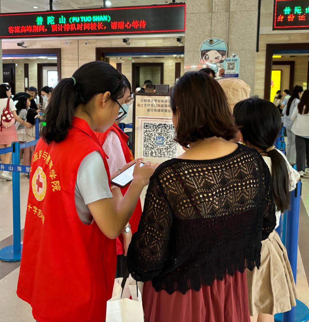 本次志愿服务活动为期六天,每天约有20名志愿者轮岗服务。他们的身影活跃在客流如织的朱家尖客运中心:门口处,“红十字爱心服务站”格外醒目,志愿者们备好急救箱以应对游客突发的不适,还耐心为初来乍到的游客指引方向,帮助他们顺利前往检票大厅;大厅内,志愿者们化身“贴心助手”,娴熟地协助未携带身份证的游客办理临时身份证明,细致解答购票与班次疑问,并在绿色通道处认真负责地进行检票核验,保障特殊人群顺畅通行,有效缓解了客运高峰期的运营压力。