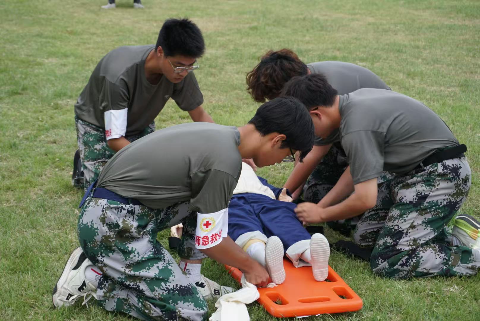 在新生军训汇报表演暨总结表彰大会上,该校医学院还组建了一支战地救护方阵,百名大学生统一着装,佩戴“红十字救护员”袖章,现场演示心肺复苏、止血包扎、固定搬运等应急救护科目,用实际行动传播人道理念。