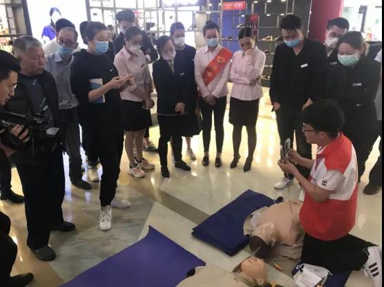 普陀区红十字会组织会员和志愿者在凯虹广场等场所开展红十字应急救护知识普及活动,发放宣传手册,传播红十字文化。