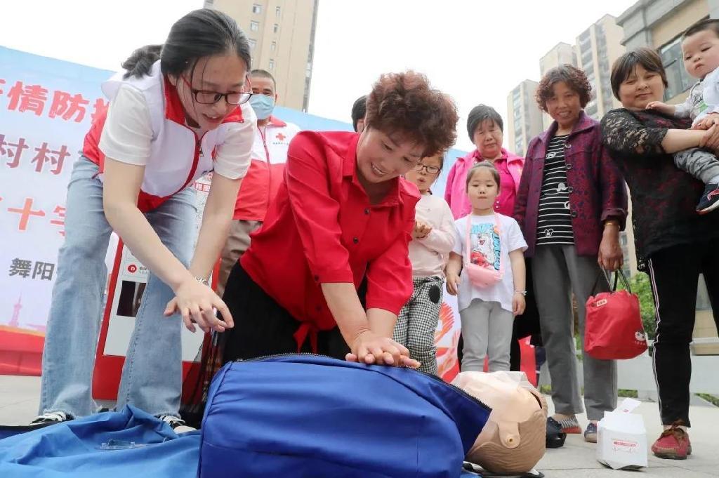 德清县红十字会组织会员、志愿者走进舞阳街道宋村村,向村民们传授心肺复苏、气道异物梗阻、外伤包扎等红十字应急救护知识和技能,提高村民的自救互救能力。