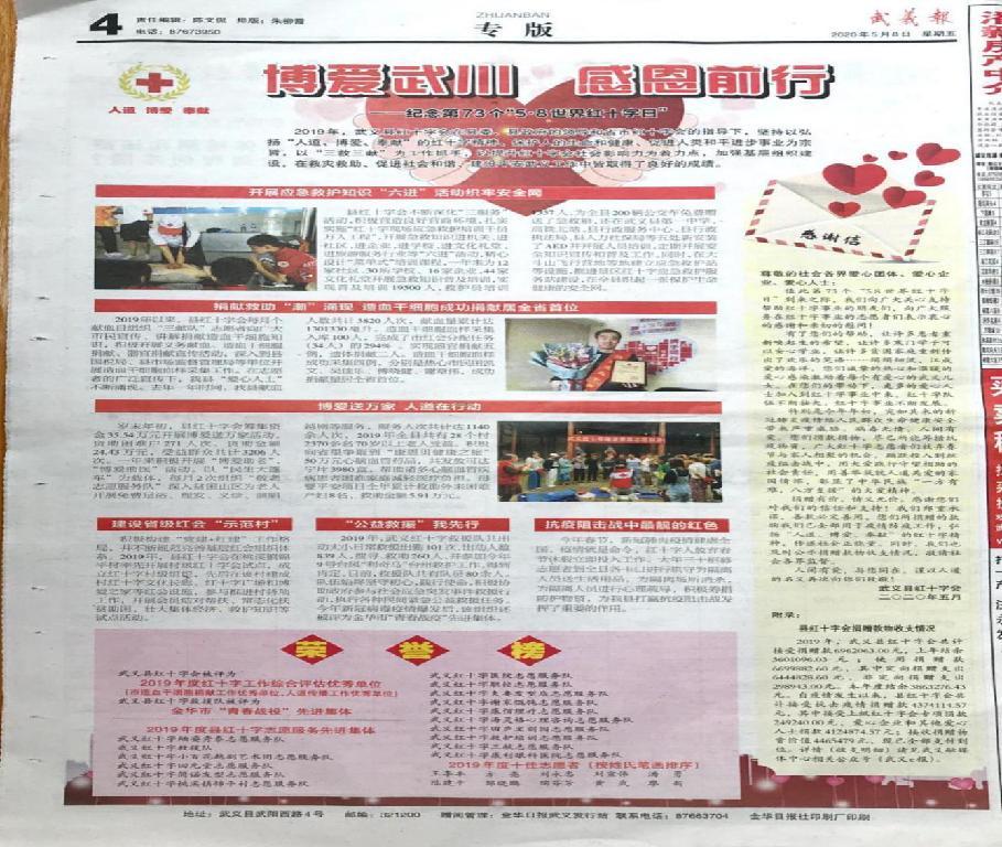 在当地媒体《武义报》专版分八个部分开展县红十字工作总结与宣传,并在武义e报公示2019年度捐赠款及抗疫期间捐赠款物接受和使用情况。