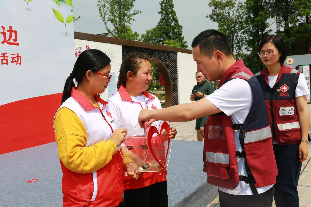 5月8日,即第73个“世界红十字”日,在德清县新市镇宋市村博爱家园广场,当地红十字会结合当前疫情防控工作实际,围绕“助力疫情防控 红十字‘救’在身边”活动主题,以抖音直播线上展示+线下培训联动方式,对新冠肺炎疫情防控、志愿服务、关爱项目等内容进行“云”宣传,大力弘扬“人道、博爱、奉献”的红十字精神。