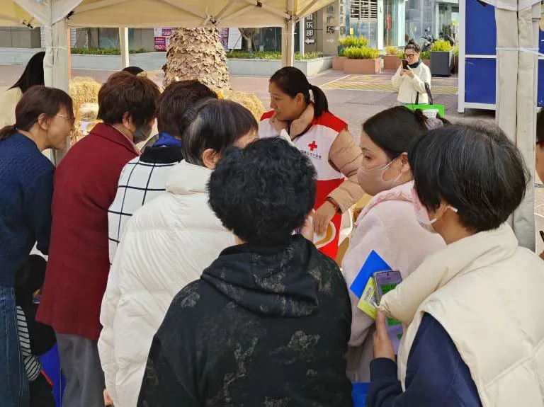 在心肺复苏模拟体验环节,市民们在红十字应急救护师的指导下学习“黄金四分钟”急救技能。浙江药科职业大学的大学生先掌握CPR+AED的实操技能,随后协助指导市民练习。此外,志愿者们还为市民提供免费测量血压服务,并讲解无偿献血、造血干细胞捐献和人体器官捐献的重要意义。活动累计发放宣传资料300余份。