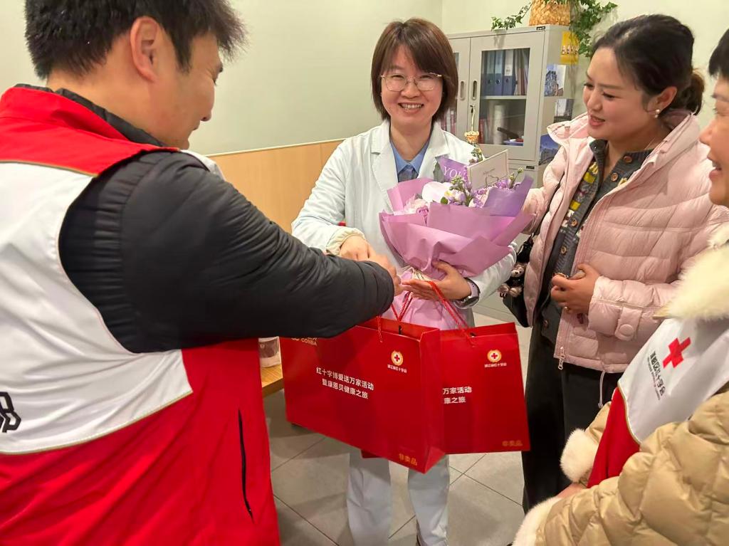 在丽水市中心医院,志愿者们看望了造血干细胞捐献者章学媛,为她送上鲜花、健康礼盒等慰问物品,并关切地询问其捐献后的身体状况和工作近况。作为医务工作者,章学媛表示,能通过造血干细胞捐献帮助他人是一件有意义的事,未来会继续支持红十字公益事业,也希望更多人了解并参与到捐献工作中。
