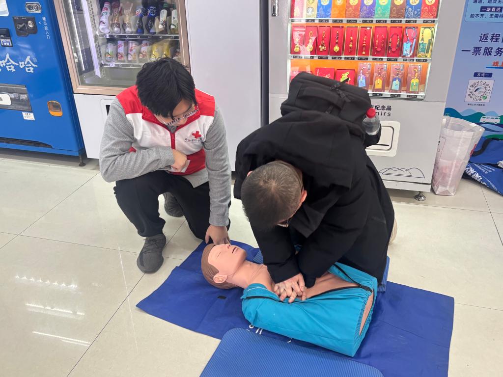 活动现场,红十字应急救护师和志愿者向过往旅客及站内工作人员发放应急救护手册与旅途安全提示,并提供面对面的咨询答疑服务。宣教内容紧扣旅途实际,重点讲解了心肺复苏(CPR)、气道异物梗阻急救(海姆立克法)以及冬季常见急症处理等核心技能。应急救护师利用模拟人进行细致演示,并邀请旅客动手体验,在“手把手”的指导中传递自救互救的关键要领。