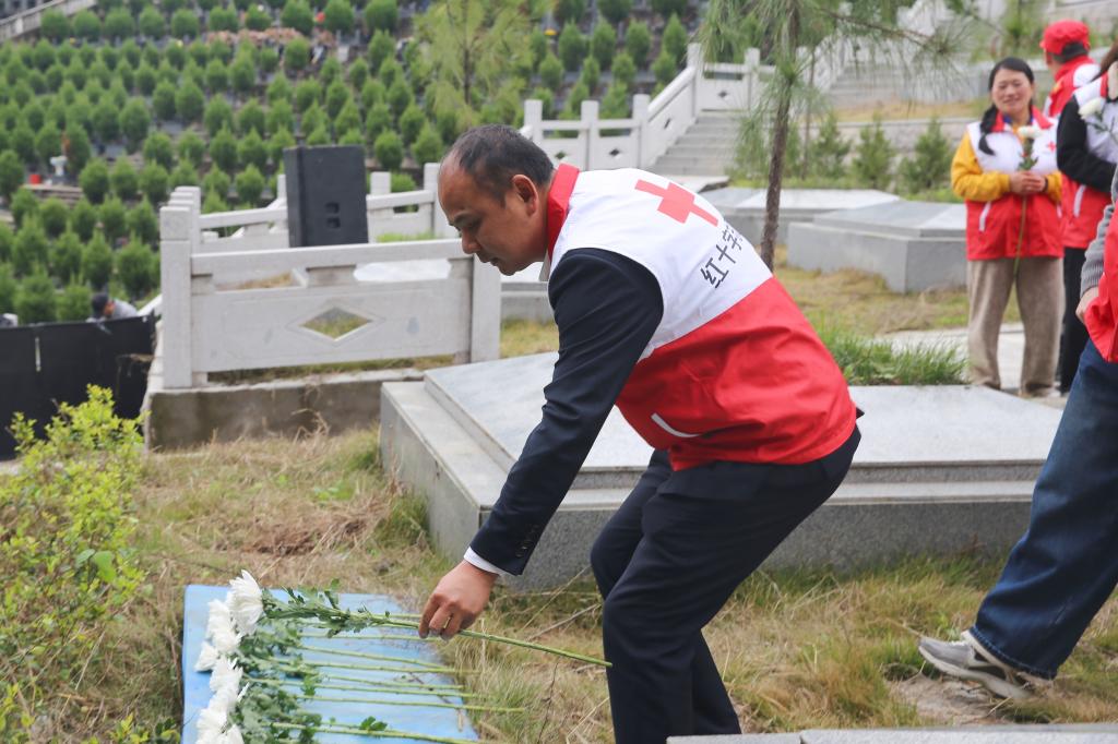 活动现场庄严肃穆,红十字应急救援队队员向纪念碑敬献花环,全体人员肃立默哀、行三鞠躬礼,深切缅怀每一位无私的捐献者。在“荣耀回家”生态葬仪式上,捐献者家属手捧亲人骨灰,缓缓完成安放、覆土、献花流程,以绿色殡葬的方式,传递对亲人的思念与生命大爱的传承。随后,全体人员有序来到名录墙前,为镌刻的每一个名字献上鲜花,致敬这些以大爱延续生命的奉献者。