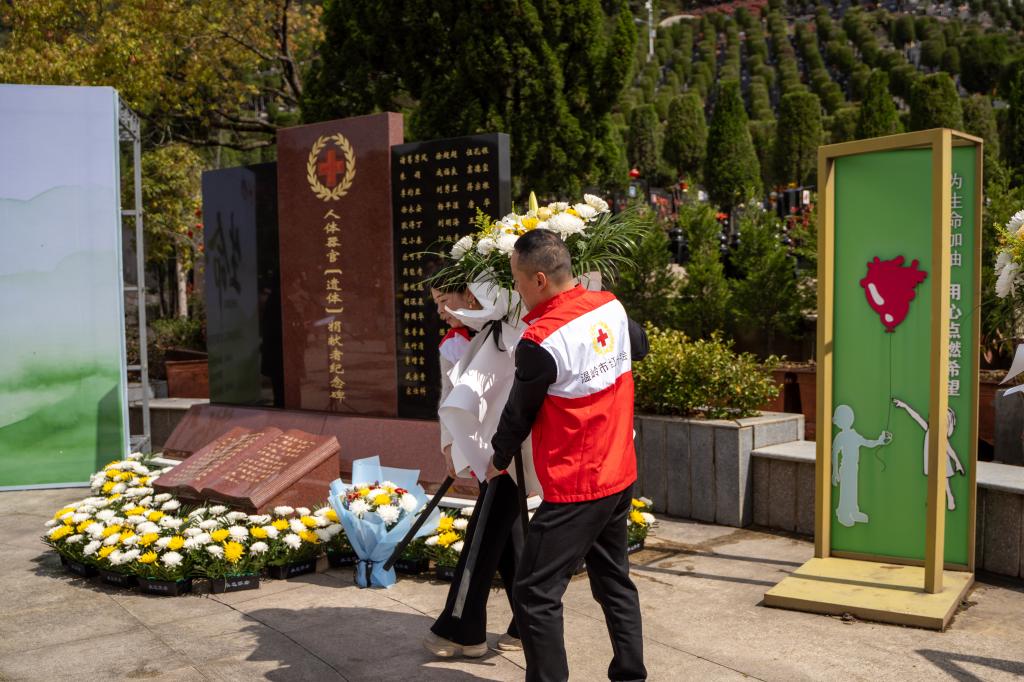 “离开你这200多天,我每天都在想你。今年清明,我特地来看你,在这里陪你说说话……”仪式开始前,贺进仙手捧鲜花站在遗体捐献纪念碑前,对逝去的丈夫诉说心里话。声声思念、句句深情,让在场之人无不动容。