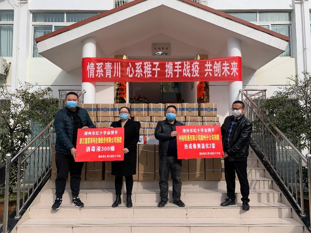 3月17日上午,四川省青川县红十字会举行了一场特殊的物资捐赠、发放仪式。仪式上,湖州市红十字会联合两家湖城爱心企业,向青川县红十字会捐赠了一批疫情防控专用物资。其中,中移铁通有限公司湖州分公司捐赠热成像测温仪2套,浙江德茵菲科生物股份有限公司捐赠消毒喷雾器10台、消毒液300桶。经青川县疫情防控指挥部批准,这批物资当即发放至青川县教育局、县人民医院和七佛乡中心小学校,助力当地开展复学防疫工作。