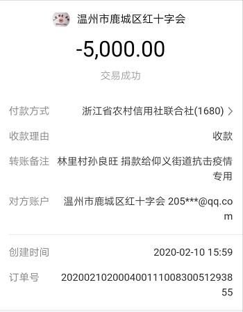 2月10日,鹿城区红十字会收到了一份特殊的爱心捐款。但这笔捐款背后的故事却让人动容。当天,仰义街道林里村93岁高龄的村民孙良旺去世,在他去世前,他做了一个不同寻常的决定,将5000元爱心款捐给区红十字会,定向用于仰义街道疫情防控一线工作人员口罩等防疫物资的购买,老人的这一善举,彰显了天下兴亡匹夫有责的公民意识、社会责任和国家忠诚。在收到善款的当天下午,区红十字会就将善款汇到仰义街道红十字会。