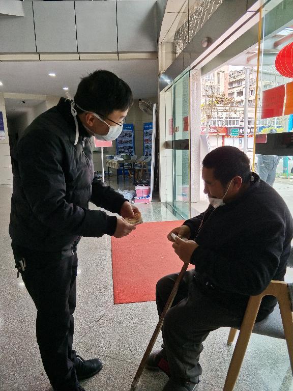 工作人员马上给老人搬了座椅,并通过交流了解到,这位老人叫毛立红,是华埠镇青阳花洲村人,在工业园区给厂区看门,从年三十开始一直留在厂区。因为去年小腿骨折尚未完全康复且这段时间公交停运,今天是撑着拐杖走走歇歇,步行两个多小时从数公里外的园区走来捐款的。当老人用双手颤颤巍巍的从口袋中取出一卷纸币,表示要捐献给红十字会时,在场所有的工作人员都为其深深感动!