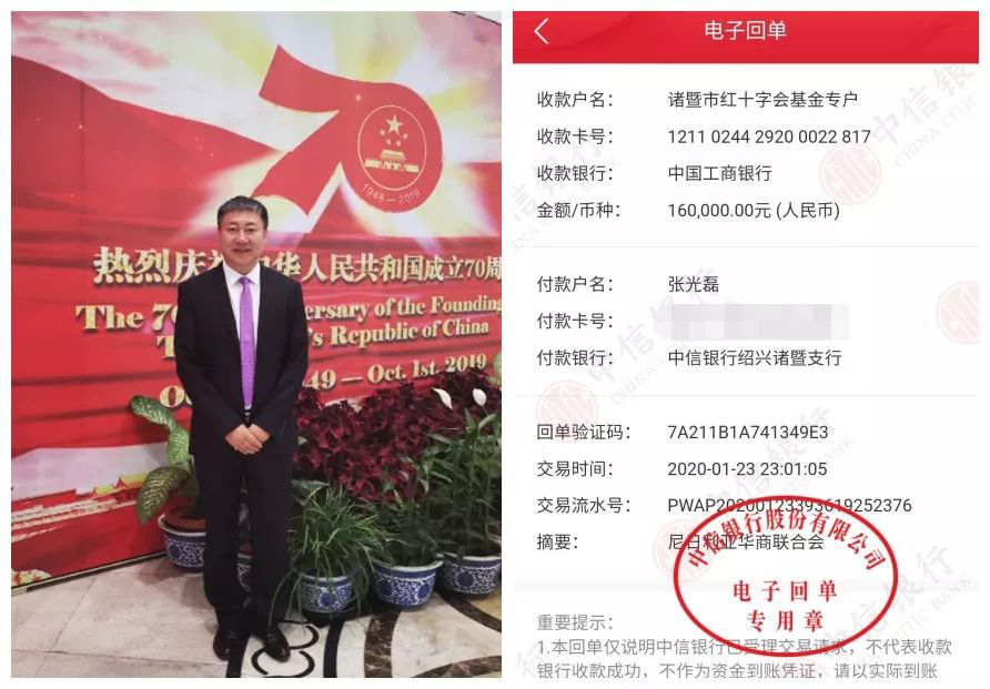 昨晚11点,诸暨市红十字会收到首笔16万元的捐款,来自尼日利亚华商联合会。捐赠代表人是诸暨陈宅人张光宇,也是一名“非洲酋长”、尼日利亚华商联合会会长……他的第一句话就是:“我每天都在关注疫情,想着身为中国的一份子,必须要做些什么,这责无旁贷!”昨天下午,利用尼日利亚华商联合会筹备春晚的时机,作为会长的张光宇带头发动募捐。“倡议一发出,十多个副会长单位积极响应,仅仅一两个小时,就募集到了16万元。”张光宇介绍。募集到钱后,张光宇第一时间通过绍兴市红十字会联系到诸暨红十字会,让弟弟把钱汇了过去。不过,这仅是第一轮捐款,张光宇说,在今天(大年三十)晚上的尼日利亚华商联合会春晚中,还将在现场发动第二轮募捐。“届时有理事单位、会员单位等100多家,募捐的资金或将更多。”