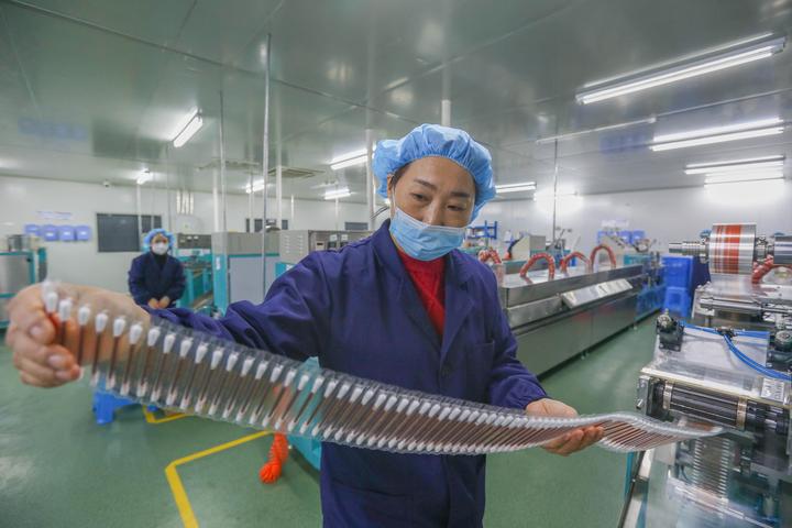 1月27日上午,位于湖州莫干山高新区的浙江隆泰医疗科技股份有限公司,防护罩、消毒车间和棉棒车间,免洗手消毒凝胶、碘伏棉签等产品正在加快生产。防护罩、消毒车间主管杨明珠告诉记者,1月26日,公司恢复免洗消毒凝胶的生产,2条生产线已经正常生产。