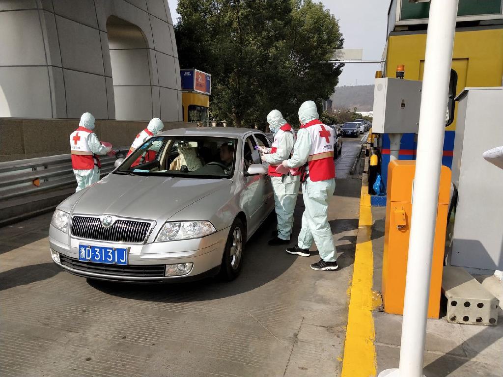 镜头四:新昌县红十字会派队员支援新昌高速道口、城南乡高速道口,多时段支援新昌高速道口、城南乡高速道口、双彩乡高速道口、沙溪镇高速道口,每日40人次轮班,新昌道口发放宣传单2000余份,24小时支援新昌高速道口,测量体温,发放宣传单。