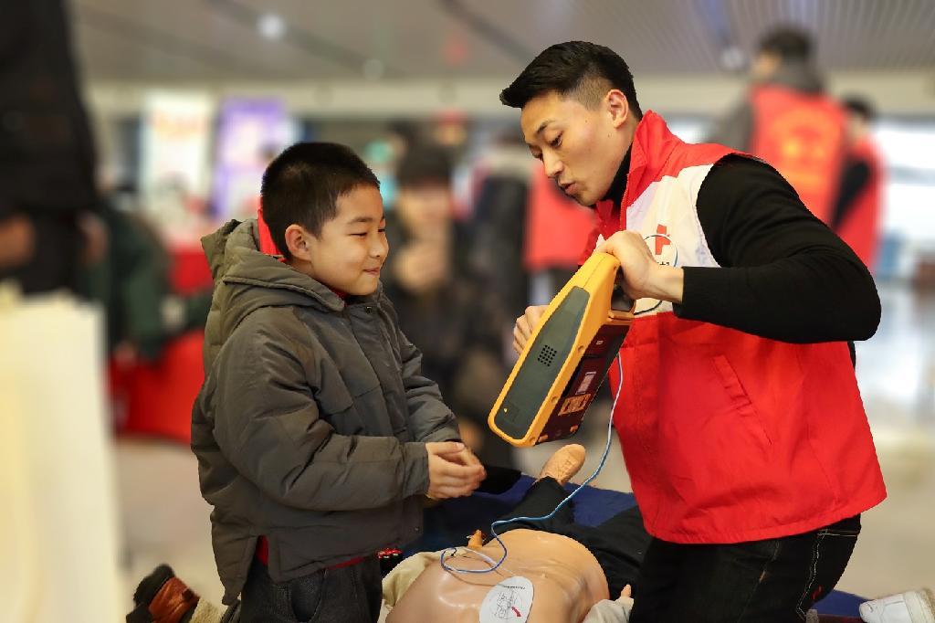 1月10日,湖州市红十字会联合国网湖州供电公司“闵华团队”来湖州高铁站,开展应急救护培训志愿服务,为返乡旅客普及应急救护知识,详细讲解学习心肺复苏术和AED(自动体外除颤器)的操作使用方法,吸引了众多旅客围观学习。一位市民表示,经常从电视上看到突发心脏病死亡的案例,感到学点急救技能很有用处,关键时刻,也许就可以挽救他人生命。