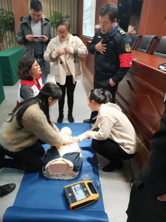 接着,陈老师一步步教大家如何应对心脏骤停等突发状况。虽已是晚上,机关干部们听讲专心,记录认真,每一个重点救护技能讲解和演示完毕后,还有人员积极提问。在操作演练部分,大家纷纷上前在老师指导下操作起胸外按压和AED,力求每一个动作标准到位。