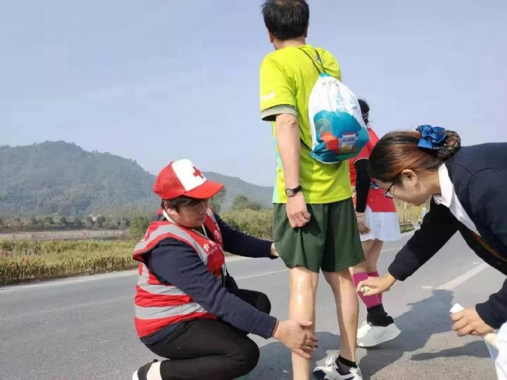 在比赛期间,红十字志愿者们全程、全赛道关注参赛选手,对受伤的参赛选手进行赛道观察,专业救护处理。志愿者们以热情的笑容、细致的服务、高度的责任心展现了红十字志愿者志愿服务风采。