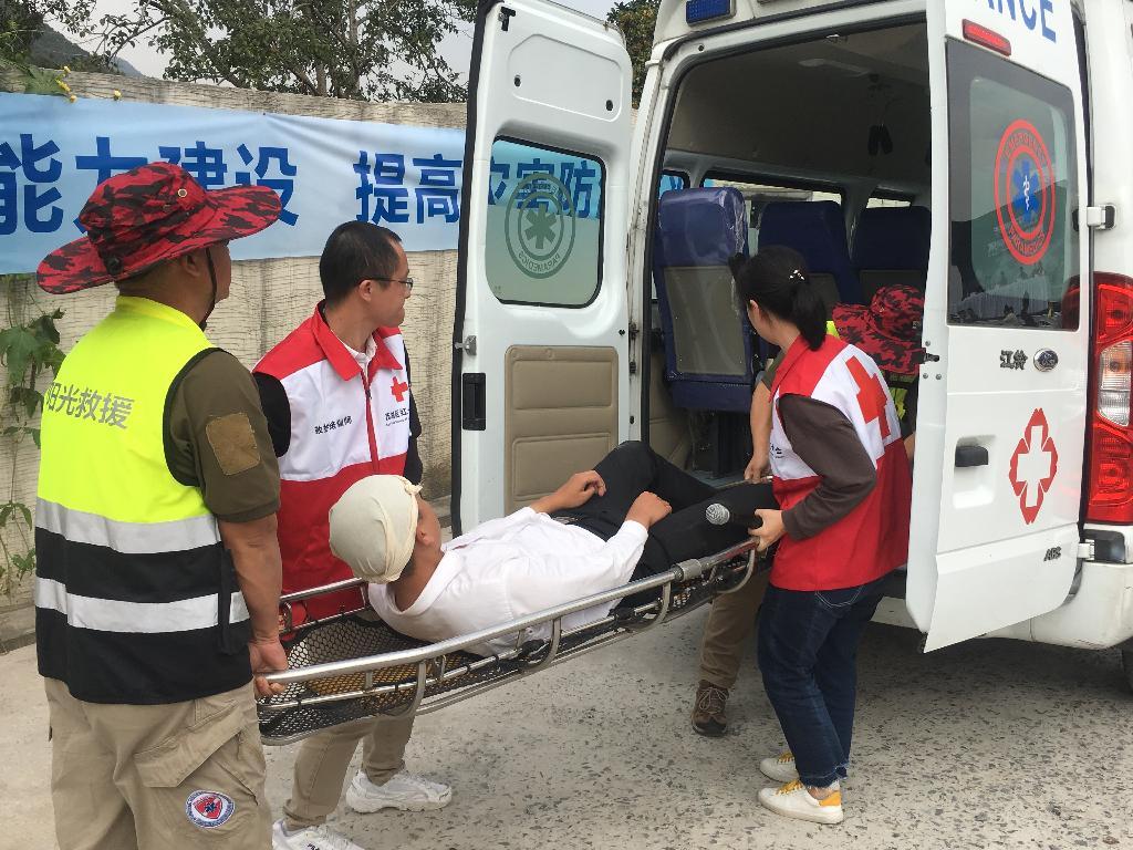 演练设置了两个救援场景,游客在山上被困和居民被倒塌房屋所困。无人机在现代救援中发挥中重要作用,时时拍照,及时传回现场情况,确定被困人员位置。根据无人机提供的信息,训练有素的队员们听到指令后,迅速准备好物资,抬起担架跑向后山,将被困游客转移至安置房。在房屋倒塌现场,通用生命探测仪和搜救犬确定人员被压位置,救援队员运用液压扩张器,打开救援通道,将被困人员抬上担架。红十字医疗组现场检查包扎,送完医院做进一步治疗。整个过程紧张有序,环环相扣。