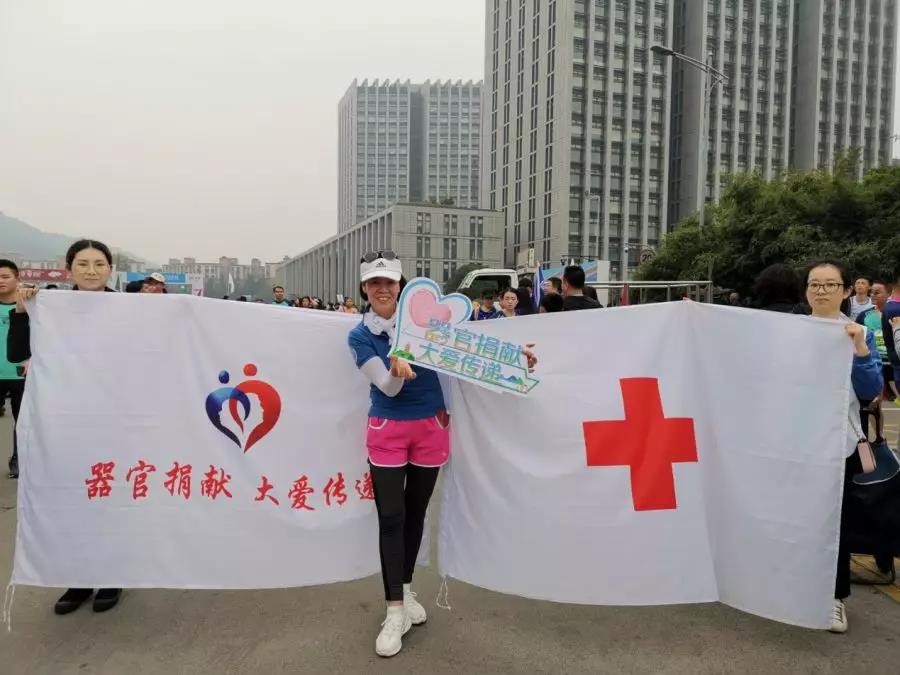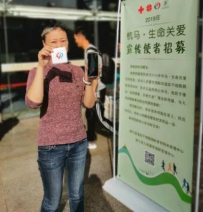 这位来自香港的跑者,看到红十字旗帜跑过来合影,她说她已经登记,志愿捐献全身可用器官和遗体。