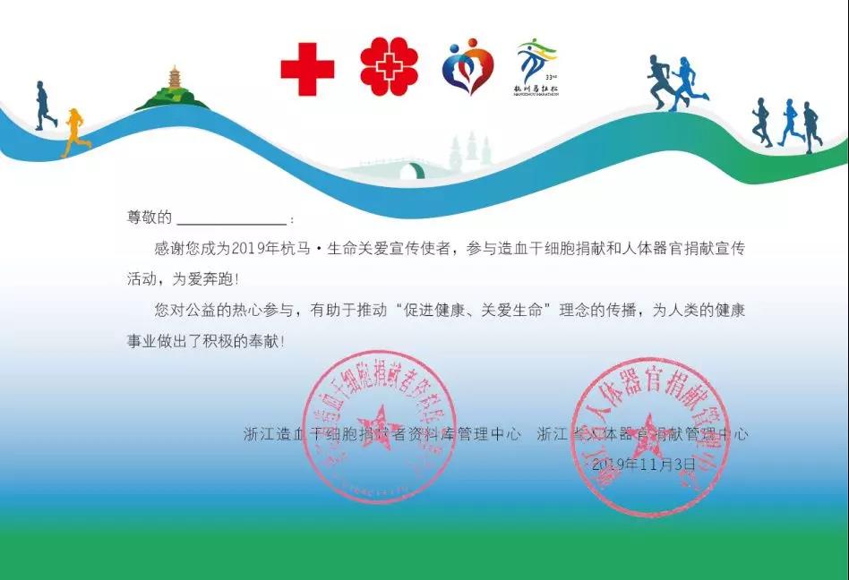 另外,还未领取“生命关爱宣传使者”证书的跑友们,请拨打电话0571-85043999与我们联系,我们将会为您寄送证书。