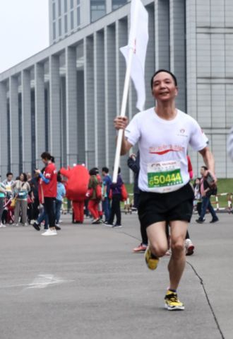 身着“器官捐献 生命接力”T恤的周军强,是一位肝移植受者,他扛着鲜艳的红十字旗帜跑过终点,在杭马的赛道上展现生命的精彩,感恩这个温暖的世界!