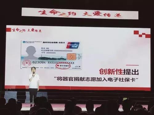 在当天的活动上举行了温州市电子社保卡与中国人体器官捐献志愿登记系统对接启动仪式。今后,只要在中国人体器官捐献志愿登记系统登记成功的志愿者,其电子社保卡上都有一个小爱心的标志,以便人体器官捐献工作的开展。“生命之光”器官捐献宣传志愿服务团相关负责人说:“我们经过多方论证,认为该创新举措符合中国的国情,有利于医生在查阅该患者档案信息时,第一时间了解患者的捐献意向,能更好地发挥器官捐献志愿登记的意义。”