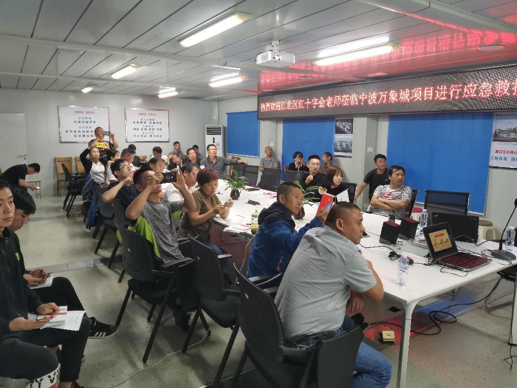 10月12日的夜晚,江北湾头,施工的工地已经没有机器的吵杂声,一幢幢拔地而起的高楼静静地矗立着,工人们已经下班了,但是此刻中建八局第一建设有限公司万象城项目部里却是灯火通明,一楼诺大的会议室里,挤坐着60多位学员。一堂实用而生动的应急救护培训课程正在进行着。