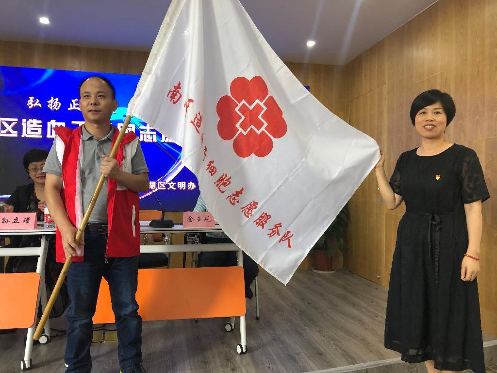 活动中,区红十字会常务副会长许爱群为造血干细胞捐献志愿服务队授旗。“我志愿成为一名红十字志愿者……”10名造血干细胞捐献志愿者共同宣誓。