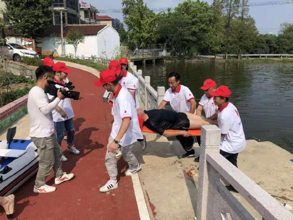 9月9日下午,虹星桥镇谭家村红十字会联合长兴县红十字救援队举行水上应急救援演练。