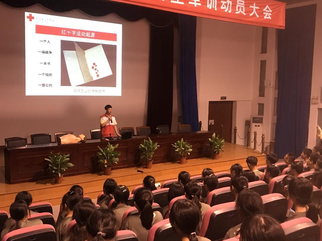 课堂上,红十字会志愿者用浅显的语言,讲述了外伤止血、中暑、溺水、触电、火灾等生活中常见紧急情况的应急处理常识,并重点讲解了急救过程中需要用到的心肺复苏术的操作步骤。在模拟人现场演示环节,同学们纷纷举手,主动要求参与,被邀请的同学在红十字会志愿者的指导下,在模拟人上练习做心肺复苏,感受各种步骤动作。