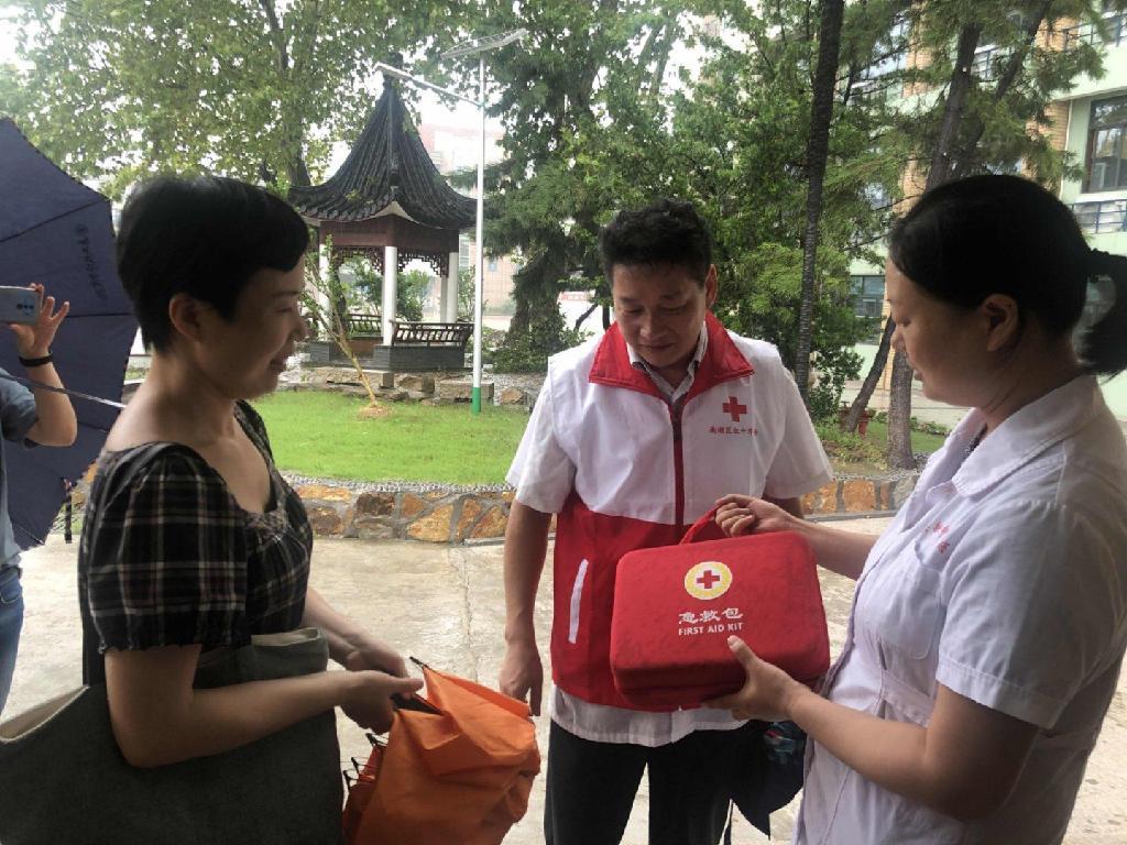 9号 “利奇马”来势汹汹,南湖区各界红十字人冲在防台抗台一线,深入社区、避灾安置点,帮助受灾群众转移,为群众送去急救箱、饮用水、雨鞋雨衣等必需品。